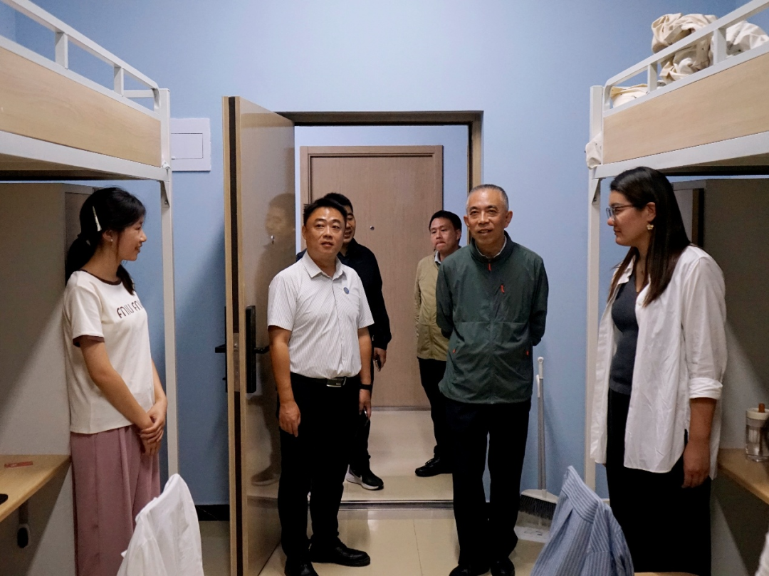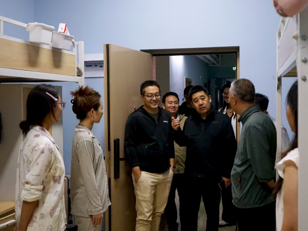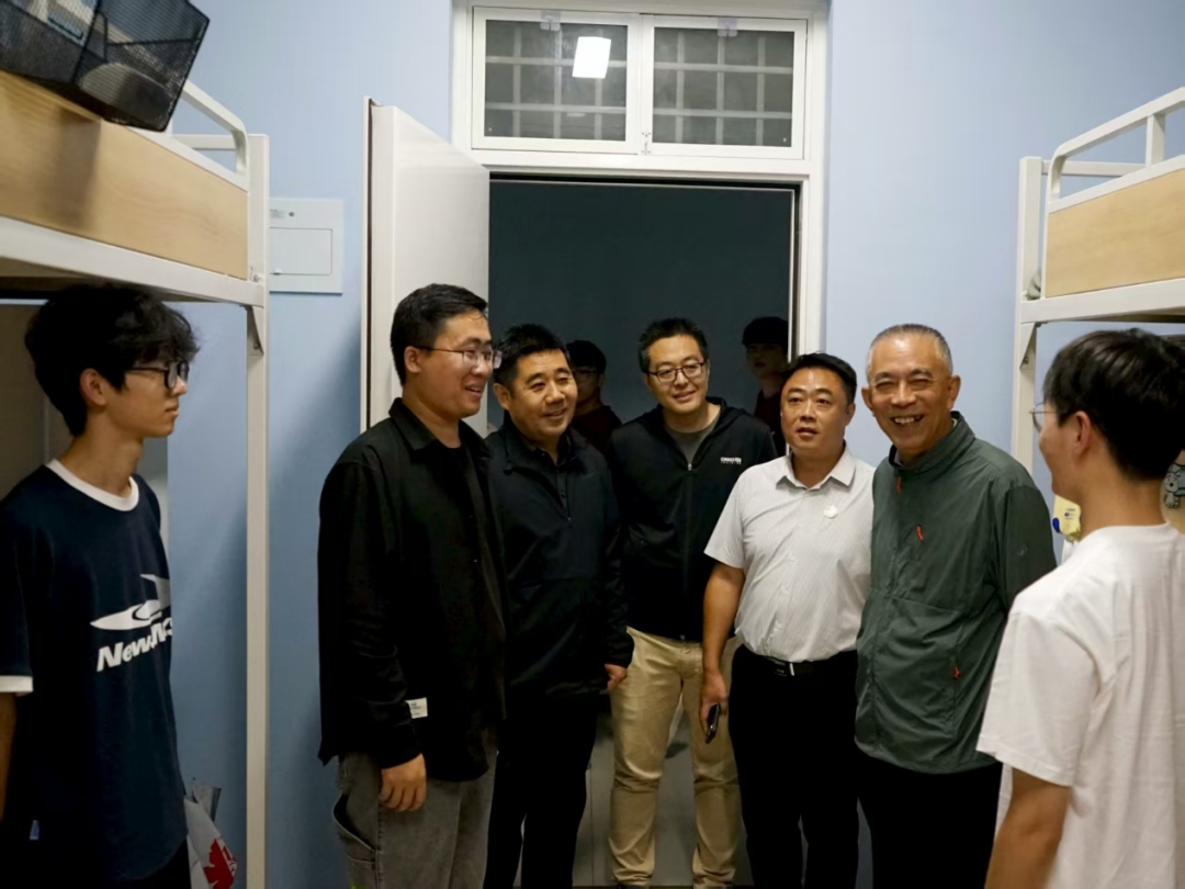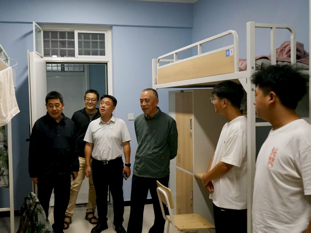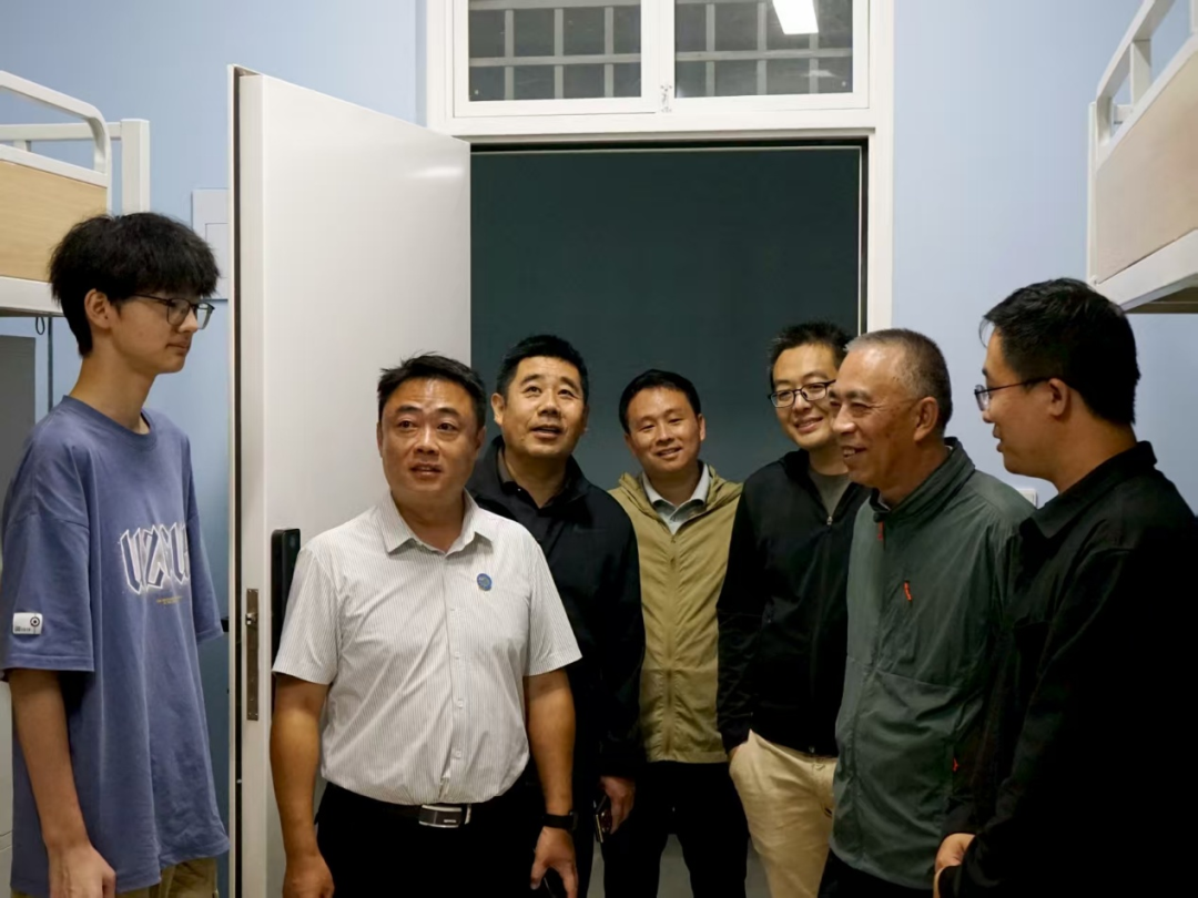 院领导们先查看了宿舍的基础设施配备、安全卫生状况及生活便利条件,重点关注床铺稳固性、空调使用、公共空间管理等细节问题。针对秋季气温变化,他们贴心提醒同学们及时增添衣物、养成规律作息。随后又围绕宿舍集体生活,强调要共同维护公共环境,建立和谐互助的室友关系,让“小家”更有凝聚力。