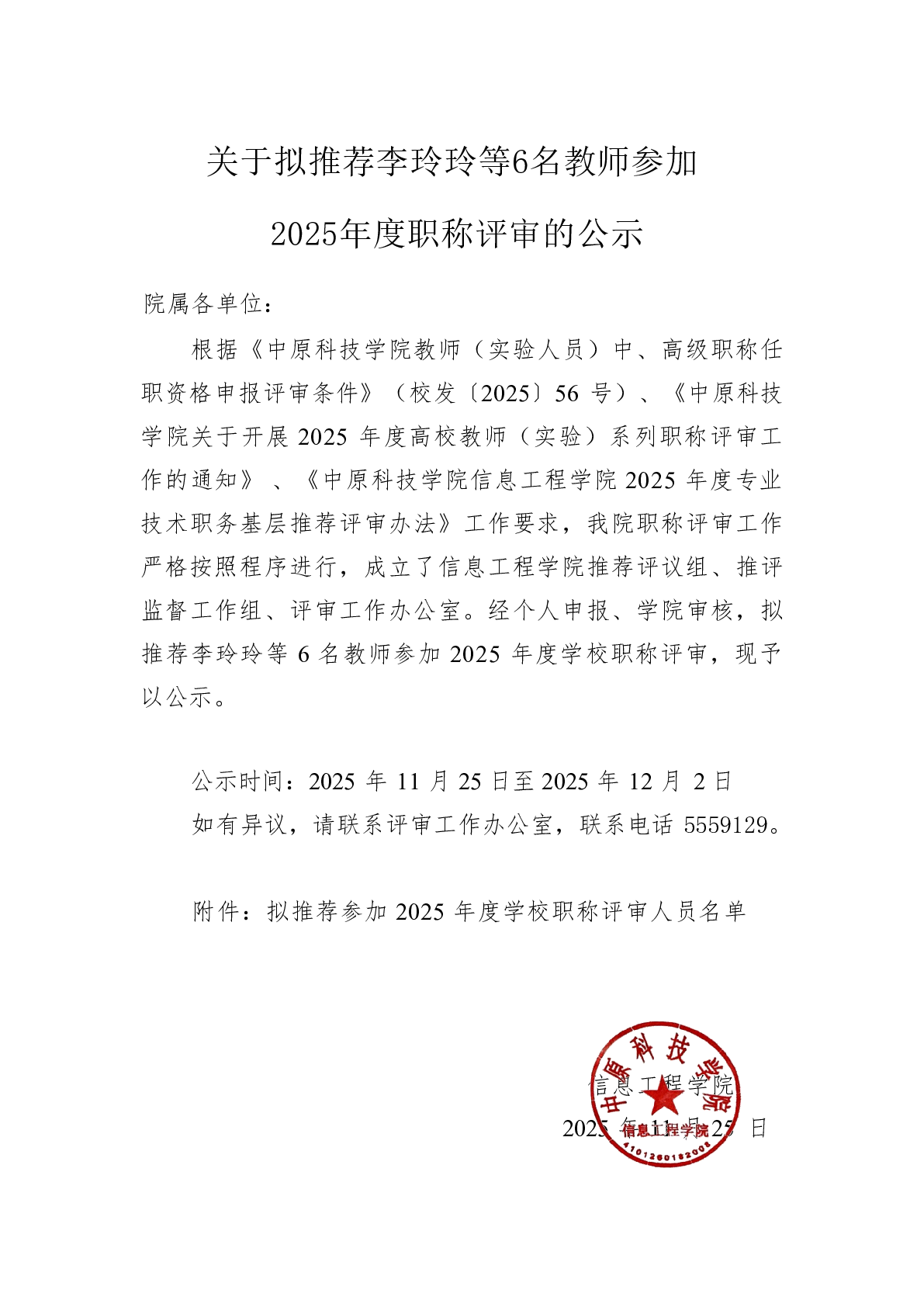 关于拟推荐李玲玲等6名教师参加2025年度职称评审的公示