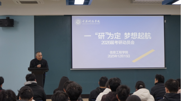 为点燃考研学子奋斗激情,凝聚逐梦前行力量,中原科技学院信息工程学院2026届考研动员会于12月15日14:30在鼎元书院M201隆重举行。理工学部执行部长、信息工程学院院长戴青,学院党总支书记、副院长李超,副院长、理工学部办公室主任崔晓峰,辅导员代表及全体考研学生代表齐聚一堂,共赴这场逐梦之约。本次动员会由学院党总支副书记苏朝峰主持。